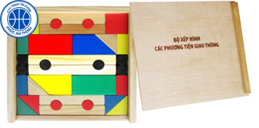 Bằng gỗ. Có 36 khối hình sơn màu, lắp ghép với nhau tạo ra các kiểu xe ô tô, với bánh xe, cabin, và thùng xe theo ý sáng tạo của trẻ, được xếp vào hộp gỗ. KT (255x225x55) mm.